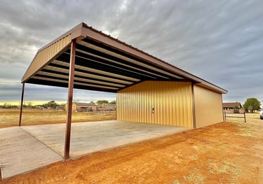 30’×60’ barn with a 30’×30’ enclosed section and a 30’×30’ awning off the gable, finished with Coco Brown trim and Saddle Tan sheeting.